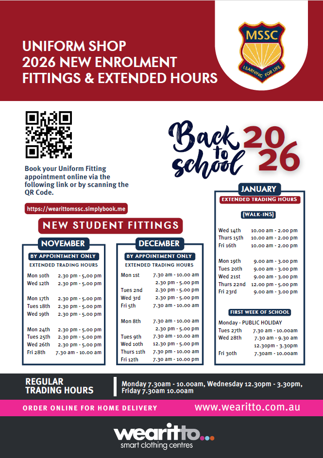 The Uniform Shop will be opening for uniform fitting appointments for new students from Monday 10th November. Most of the appointment times are outside our regular trading hours and we are offering many after-hours time slots. Please follow this link to book an appointment online https://wearittomssc.simplybook.net/ We are always trying to minimise crowd numbers and the lengthy delays associated with the busy Back to School time in January, therefore making a time to come for a fitting is preferred. Appointments are 30mins per student and whilst we understand many parents are concerned about growth spurts between now and January, the uniforms can be exchanged any time provided they are not washed, in their original packaging and a receipt is shown. Only the student being fitted is permitted into the Uniform Shop and Parents/Carers will be able to see the student to ensure correct fitting from over the counter at the front of the store. Our staff are all very experienced in uniform fittings. If you know your sizes, your order can be placed online. You have the option to either collect your order from MSSC uniform shop or have your order delivered for a fee. Please follow this link to order online: http://www.wearitto.com.au/schools/murrumba-state-secondary-college