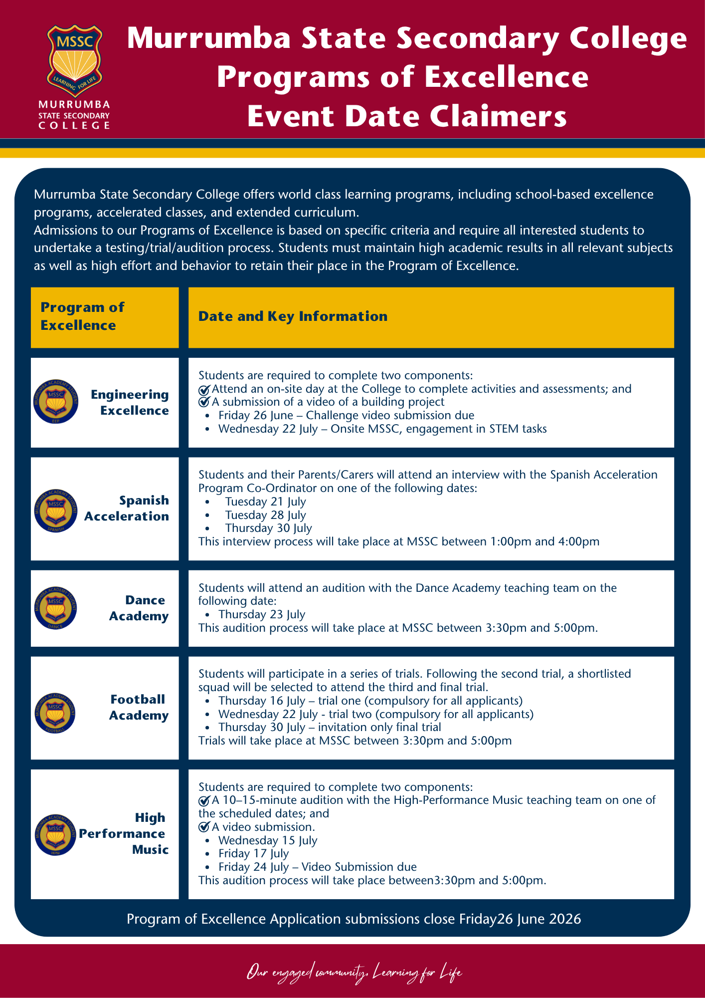 Students must maintain high academic results in all relevant subjects as well as high effort and behaviour to retain their place in the Program of Excellence.